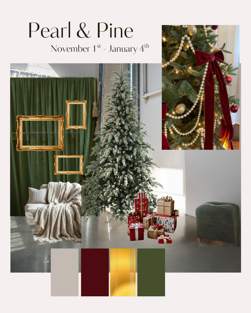 Book now- A luxe backdrop with hanging art over a dark green drapery